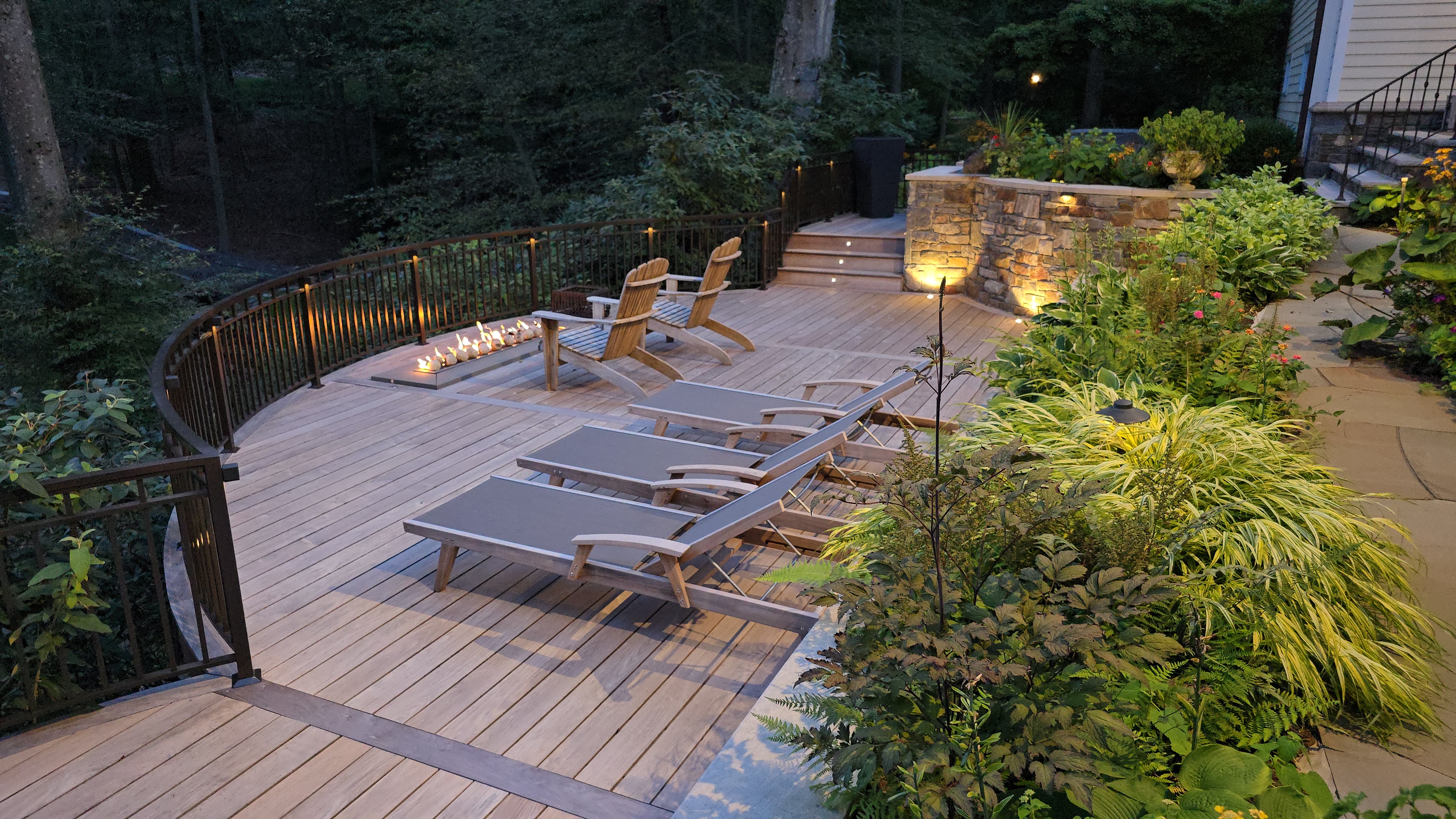 This project is a case study in how lighting can shape not just the appearance of a space, but the way it feels and functions. From the moment you step onto the deck, the illumination draws you in — not with brightness, but with balance. Subtle uplighting softens the stonework and surrounding landscape, while linear step lights and fixture placement along the railings create a rhythm that naturally guides you through each zone of the space.